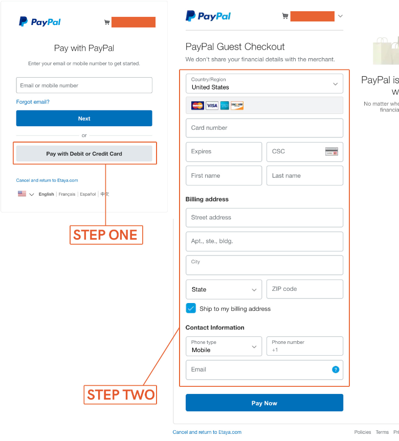 1) After viewing your items on your shopping cart page, you can click and check out with PayPal. Then you will leave our site and enter PayPal’s website.